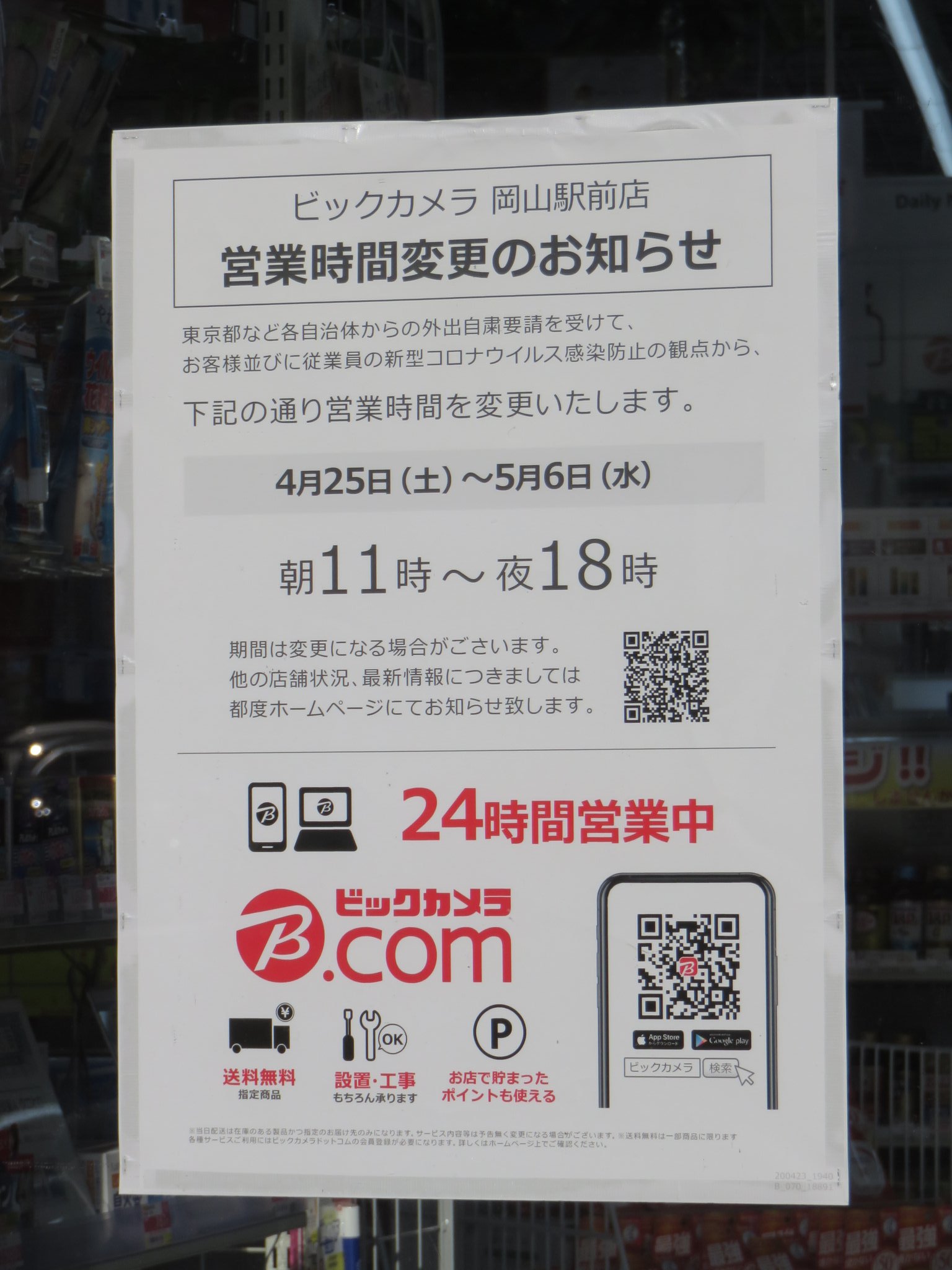 新条 Sur Twitter 岡山営業状況 4 25以降 4 24撮影 ビックカメラ 岡山駅前店 短縮営業1100 1800 4 25 5 6 通常1000 2030 さすがに仕舞いが早い 夕方の携帯電話 機種変は困難