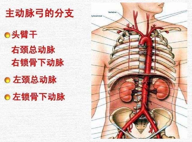 Ascending aorta 升主動脈 aortic arch 主動脈弓 brachiocephalic trunk 頭臂動脈幹 common carotid artery 總頸動脈 subclavian artery 鎖骨下動脈 axillary artery 腋動脈 thoracic aorta 胸主動脈 abdominal aorta 腹主動脈 common iliac artery 總髂動脈 包含internal iliac artery 內髂動脈.