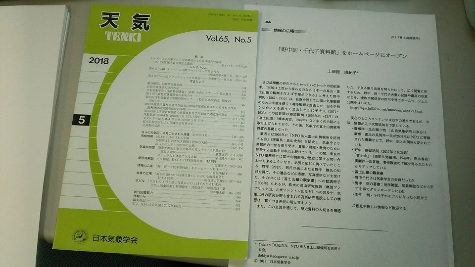 日本気象学会の会員誌 天気 に 野中到 千代子資料館 の記事が載りました 太郎坊のそよ風