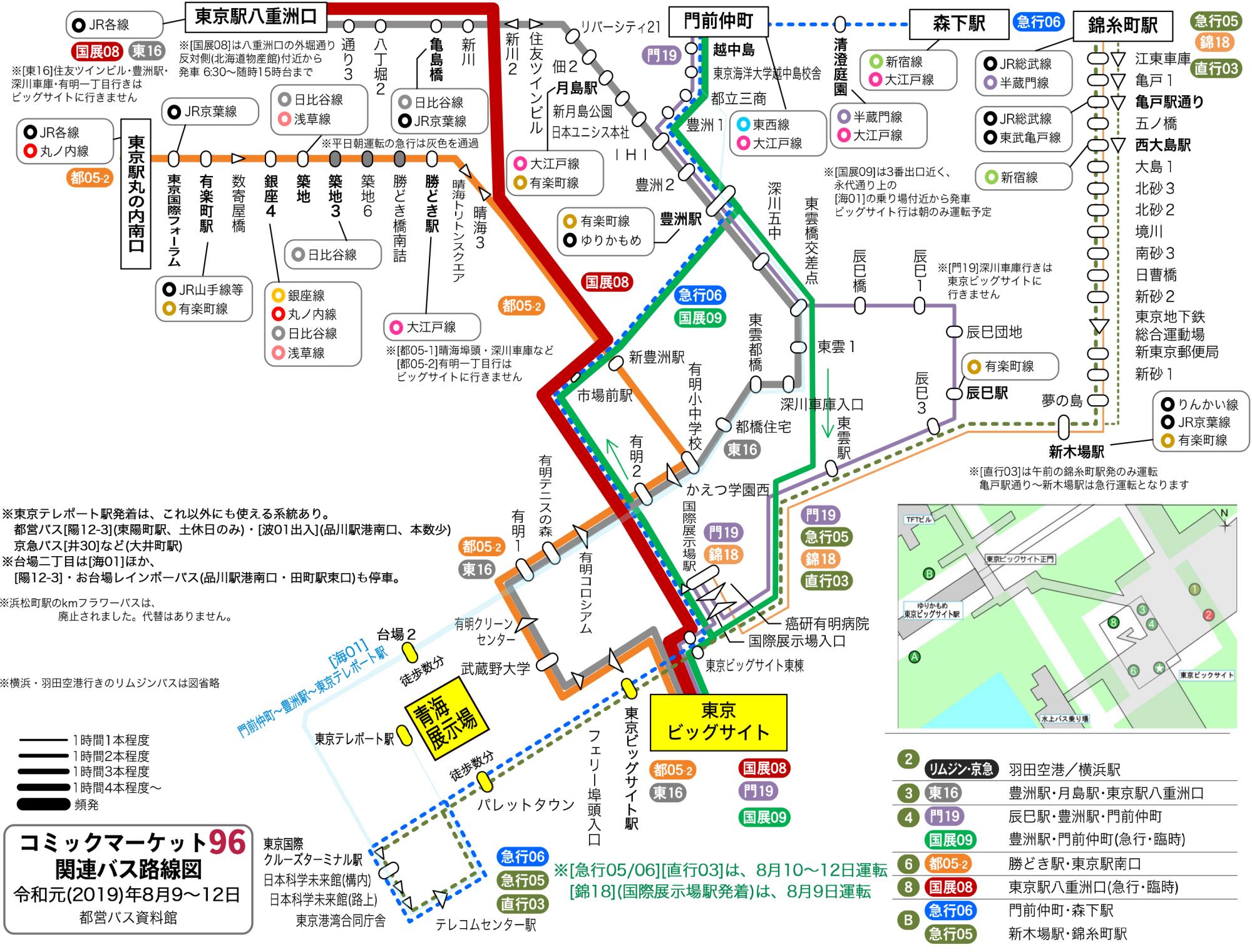 Plせつな ドワ On Twitter 毎度のコミケ バス 路線図 C96版 一番本数の出る東京発着の臨時は6 30から 帰りの臨時は17 00前まで3 6分間隔 門前仲町の臨時は随時運転だが規模は不明 青海 展示場についても少し追記しました 錦糸町 森下方面は 今回から最寄の名が